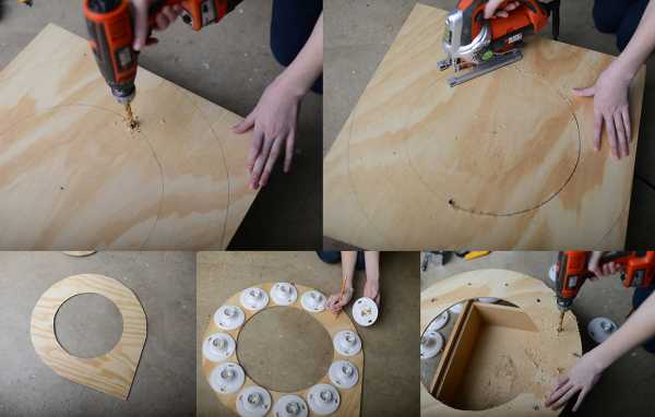 Далее закрепите карандаш так, чтобы он был на сделанной отметке – это будет ваш циркуль. Прорисуйте круг этим циркулем. Лобзиком вырежьте внутренний круг. А когда начнёте обрезать внешний – оставьте один угол для того, чтобы закрепить на него кронштейн и выключатель.