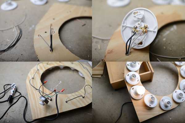 Следующий шаг – это зачистка проводов. Снимите верхнее покрытие с кабеля и отрежьте куски черных и белых жил длиной 20-25 см. В сумме вам нужно 12 таких черно-белых пар. Затем зачистите концы каждого провода, примерно на 2 см, и с помощью плоскогубцев сделайте крючки на каждом зачищенном конце. После этого проденьте по 4 провода в каждое из 12 просверленных отверстий и подключите параллельно каждый патрон.