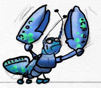 Для своего омара, я взял набросок с бумаги и обвел его по линиям. Я сделал запрос через Google , в разделе «картинки», и у меня появилась идея сделать его синим вместо красного и несколько идей по поводу его детализации. Затем я расскрасил его на нижнем слое, который поместил под обведенные линии, поэтому я не беспокоился что все смешается. Как только я его расскрасил, я установил значение «lock alpha» и просто добавил немного затенений.