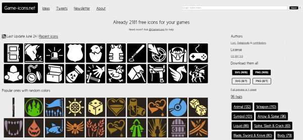 Game-icons.net – лучший сайт с бесплатными иконками, которых здесь ни много ни мало 2000. Несмотря на то что все иконки черно-белого цвета, они достаточно универсальные и могут быть использованы для обозначения действий, заклинаний, навыков, предметов и т. п. Приятный бонус – векторный формат.