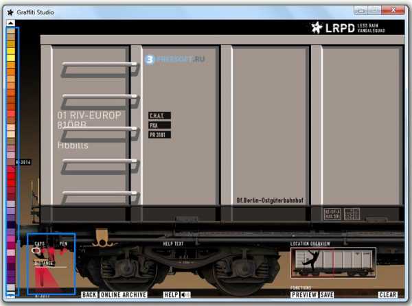 На панельке предусмотрен выбор огромного количества цветов — более 100 шт.! Есть возможность делать подтеки, менять расстояние до поверхности, использовать маркеры и пр. В общем целый арсенал граффити художника!