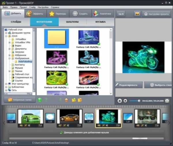 - Добавление видео и наложение звукового сопровождения. Сделать презентацию с музыкой и фотографиями при помощи этой программы легко. Для этого указывается адрес файла или перетаскивается мышкой в окно программы.