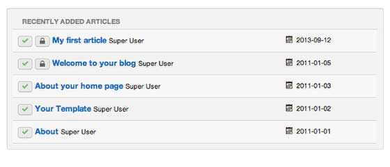 Вы можете также найти свою запись в секции «Недавно добавленные статьи» или нажав на Content («Содержание»), затем Article Manager («Управление статьями») на главной панели инструментов.