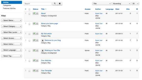 Для просмотра и упорядочивания статей на вашем сайте, закройте статью, которую вы редактировали и нажмите на Content (Контент), а затем на Управление Статьями.