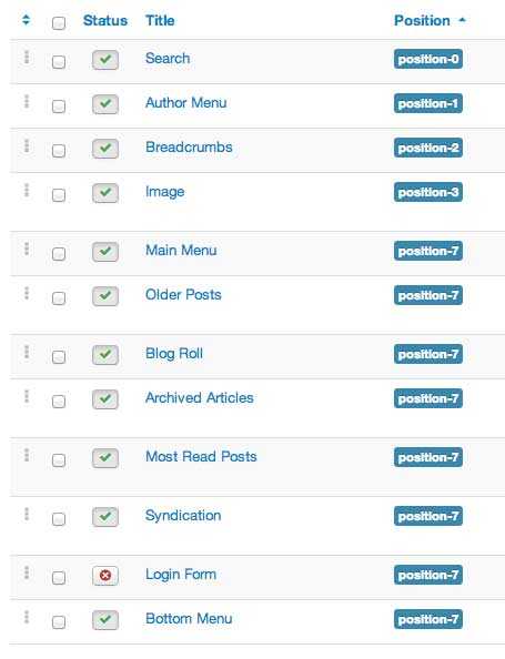 После этого вы сможете просмотреть названия всех областей, которые вы разместили на сайте. Глядя на модули по умолчанию, вы можете подтвердить, что многие из них действительно находятся в положении position-7