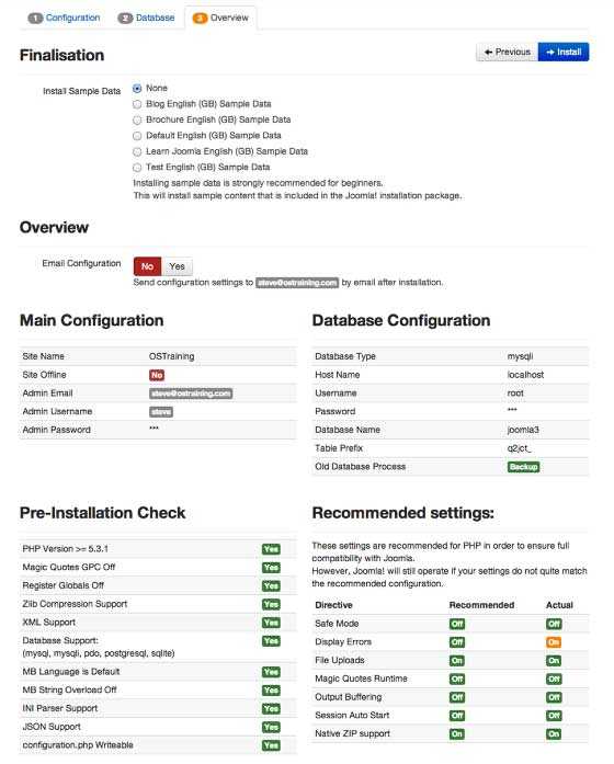 На заключительном экране инсталлятора вы можете выбрать тип данных. Наведите курсор на каждый из образцов, чтобы получить объяснение. Ниже вы увидите обзор настроек конфигураций. Джумла также проверяет правильно ли настроен сервер. Если что-то будет нуждаться в коррекции, это будет подсвечено красным цветом.