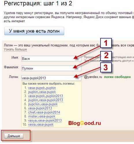 С фамилией и именем все понятно – здесь вводите свои реальные данные. А вот логин обязательно должен состоять лишь из английских букв, а также могу присутствовать цифры, точка и дефис. Если вы введете уже существующий в системе пароль, вам будет предложено несколько вариантов свободных имен. Как правило, предлагается всякий бред