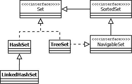 TreeSet — аналогично другим классам-реализациям интерфейса Set содержит в себе объект NavigableMap, что и обуславливает его поведение. Предоставляет возможность управлять порядком элементов в коллекции при помощи объекта Comparator, либо сохраняет элементы с использованием «natural ordering».