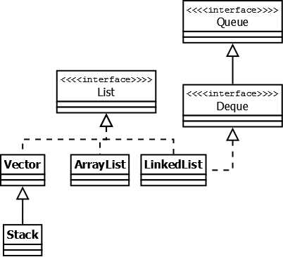 Stack — данная коллекция является расширением коллекции Vector. Была добавлена в Java 1.0 как реализация стека LIFO (last-in-first-out). Является частично синхронизированной коллекцией (кроме метода добавления push()). После добавления в Java 1.6 интерфейса Deque, рекомендуется использовать именно реализации этого интерфейса, например ArrayDeque.