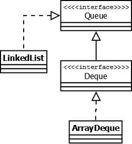 Этот интерфейс описывает коллекции с предопределённым способом вставки и извлечения элементов, а именно — очереди FIFO (first-in-first-out). Помимо методов, определённых в интерфейсе Collection, определяет дополнительные методы для извлечения и добавления элементов в очередь. Большинство реализаций данного интерфейса находится в пакете java.util.concurrent и подробно рассматриваются в данном обзоре.