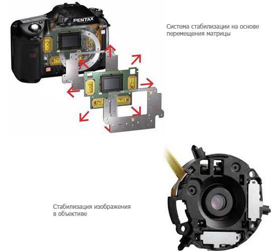 Оптическая и матричная стабилизация предполагает, что в фотоаппарат (или объектив) встроены специальные датчики — гироскопы или акселерометры. Эти датчики постоянно определяют углы поворота и скорости перемещения фотоаппарата (или объектива) в пространстве и выдают команды электрическим приводам, которые отклоняют стабилизирующий элемент объектива или матрицу фотоаппарата.