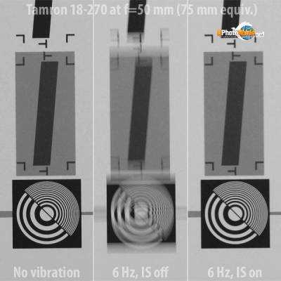 Левый снимок сделан при отсутствии вибраций. Средний – со включенной вибрацией и выключенным стабилизатором. Правый – вибрация по-прежнему составляет 6 Гц, но стабилизатор при этом включен. В идеале должно получиться изображение, как на снимке слева, безо всякого смазывания – в этом случае мы скажем, что стабилизатор полностью скомпенсировал вибрации. В каждом случае делалось пять дублей, для иллюстрации отобран лучший вариант.