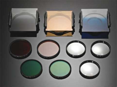 o Конверсионные фильтры для фотографирования при свете ламп накаливания на цветную фотоплёнку, предназначенную для солнечного освещения и наоборот.