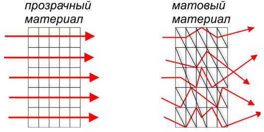 У прозрачных материалов кристаллическая решётка упорядочена, и фотоны от источников света, проходя сквозь него, не изменяют траекторию. В случае матового оттенка, у каждого микро слоя своя структура.