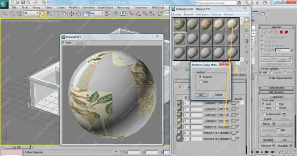 Задаем необходимое число «подматериалов» (кнопка Set Number). Материалы копируем перетаскиванием из ранее созданных. В появившемся окне указываем тип копирования — Instance. Новый «подматериал» связан с оригиналом, его изменение затронет оригинал и наоборот.