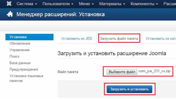 Следующим шагом станет активация функции «Загрузить файл пакет». Далее жмем «Выбрать файл» и ищем на компьютере до этого установленный JCE редактор в виде архива. Стоит заметить, что абсолютно все расширения предоставляются в форме архива формата zip. Выбираем компонент и жмем иконку «Загрузить и установить».