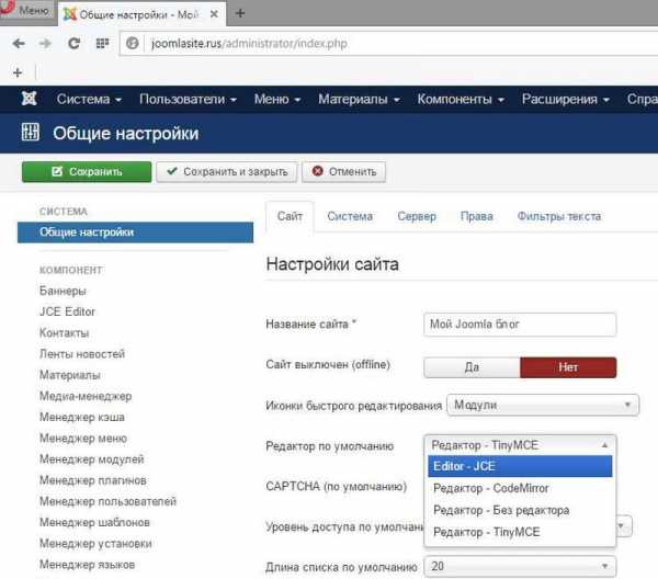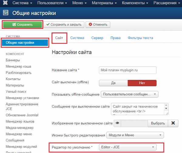 В открывшейся вкладке настроек в поле Редактор по умолчанию выбрать Editor — JCE, нажать кнопку Сохранить и закрыть.