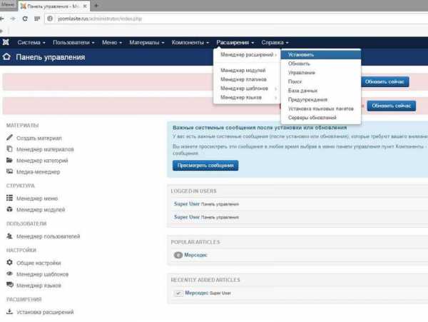 Как уже я говорил, изначально все инструменты редактора будут отображаться на английском. В основном все расширения для Джумла устанавливаются через «Менеджер расширений».