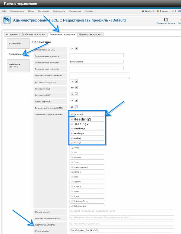 В данной вкладке интересны настройки в поле «Элементы форматирования», которые нужны для того чтобы можно было быстро задать необходимые форматы текста в материале, в моем случае я отобрал только теги h2-h6 и тег p. Также интересен пункт «Удаляемые шрифты», где можно перечислить все шрифты, которые не нужно показывать на сайте. Необходимо когда вы к примеру вставляете текст из MS Word.
