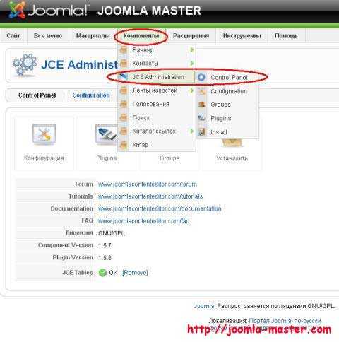 Для того, чтобы перейти в раздел настроек JCE, в административной панели Джумлы необходимо зайти: