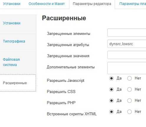 — Расширенные. Здесь нас интересуют четыре последних команды – «Разрешить Javascript», «Разрешить CSS», «Разрешить PHP», «Встроенные скрипты XHTML». Напротив каждого параметра устанавливаем «Да».