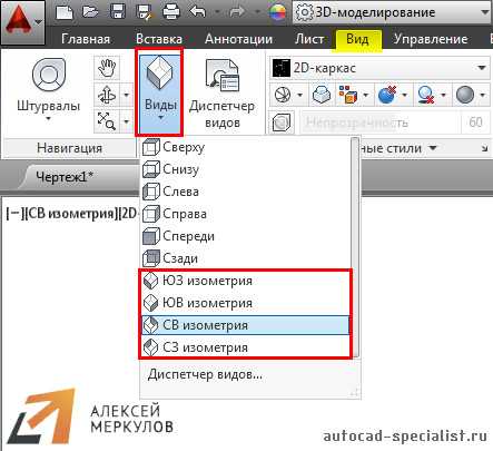 Ну и еще один вариант, это перейти на вкладку «Вид», выбрать панель «Виды» и там в выпадающем списке можно выбрать стандартные виды графического пространства.