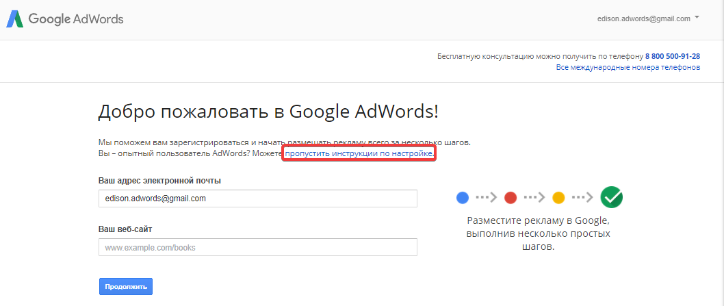 Перейдите на сайт сервиса Google AdWords и войдите в систему. Зарегистрируйте аккаунт в Google, если не сделали этого раньше. Укажите электронную почту и адрес сайта. Согласитесь принимать сообщения о повышении эффективности кампаний. Нажмите кнопку «Продолжить».
